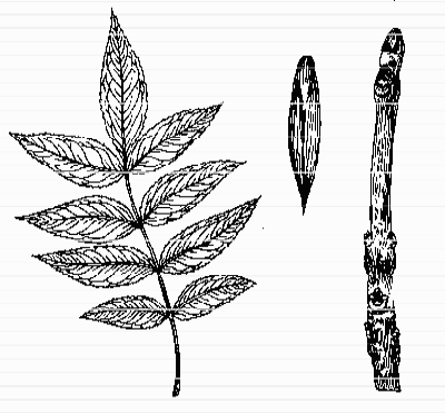 TWIGS: Stout, gray or red-brown with many pale lenticels, somewhat hairy at first, becoming smooth, end buds dark brown to black and pointed, adjoining leaf scars are not notched at the top, nearly circular, with raised margins. The first pair of lateral buds are some distance below the end bud.
