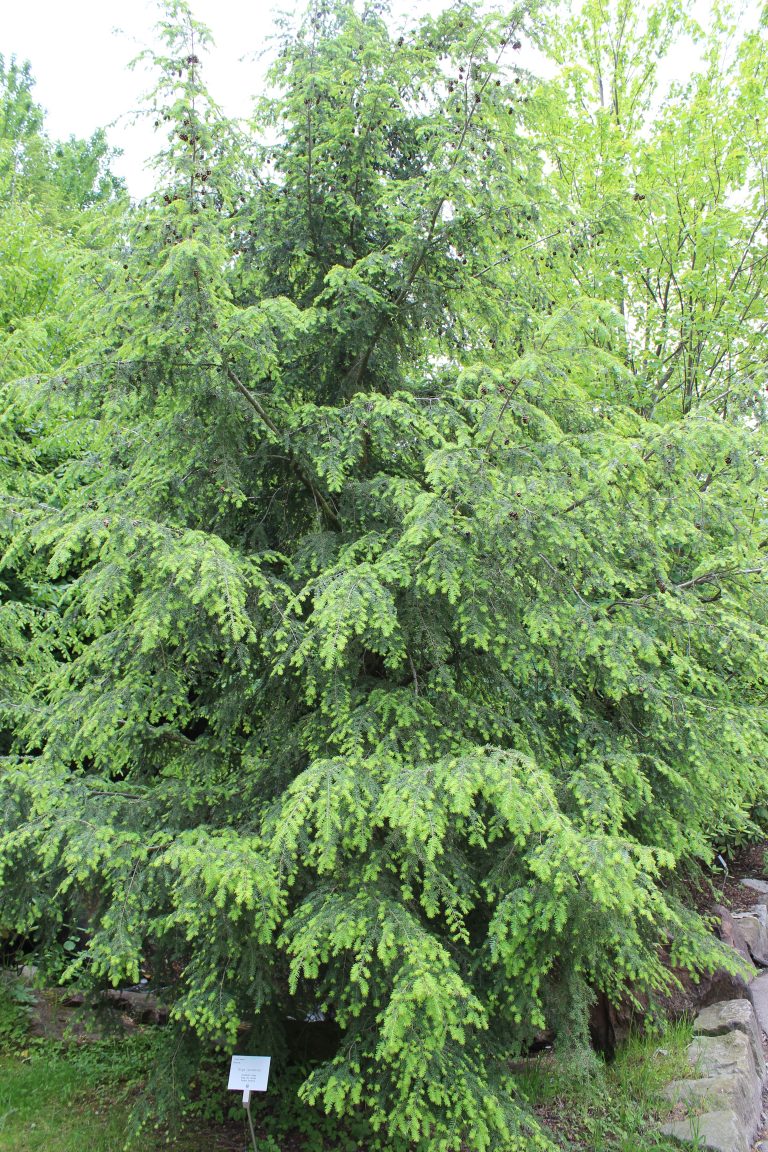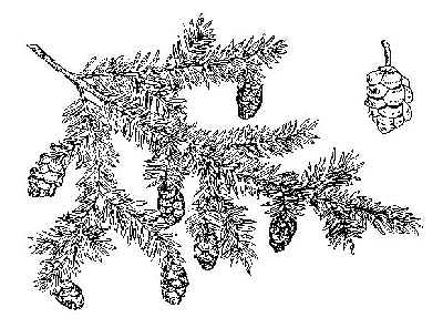 FRUIT: Cones 3/4″ long, egg-shaped, hanging singly from the tips of twigs. Under each scale are 2 small, winged seeds.